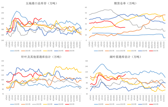 截至2025年6月19日,我国五地港口总库存同比+22%,其中针叶港库同比-5%,阔叶港库同比+71%;期货仓单+厂库量同比-50%。