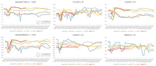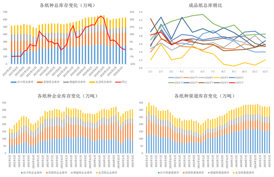 2025年5月,纸浆系成品纸企业库存同比-1%,渠道库存同比持平,总库存同比持平。