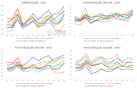 2025年1-4月,W20化学浆发运至北美量累计同比-3%;至西欧累计同比-4%;至中国累计同比+12%。