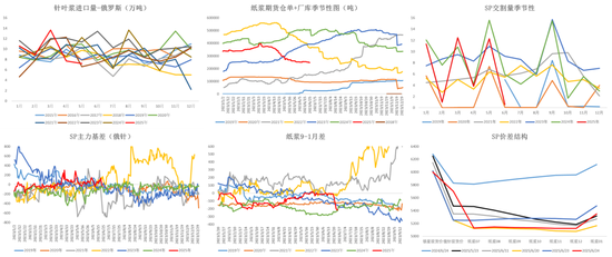 底部估值:综合考虑欧针和部分加针的边际成本约690美元,结合基差推算针叶边际成本线大概在5100-5200元区间;但今年是阔叶主导的熊市行情,阔叶底部估值的重要性更大,目前阔叶现货价格4000-4100元已接近进口木片制浆成本,若继续下探,则需关注国产木片制浆成本约3600元,参考去年阔叶基差低点,折算盘面底部估值或在5000点附近。